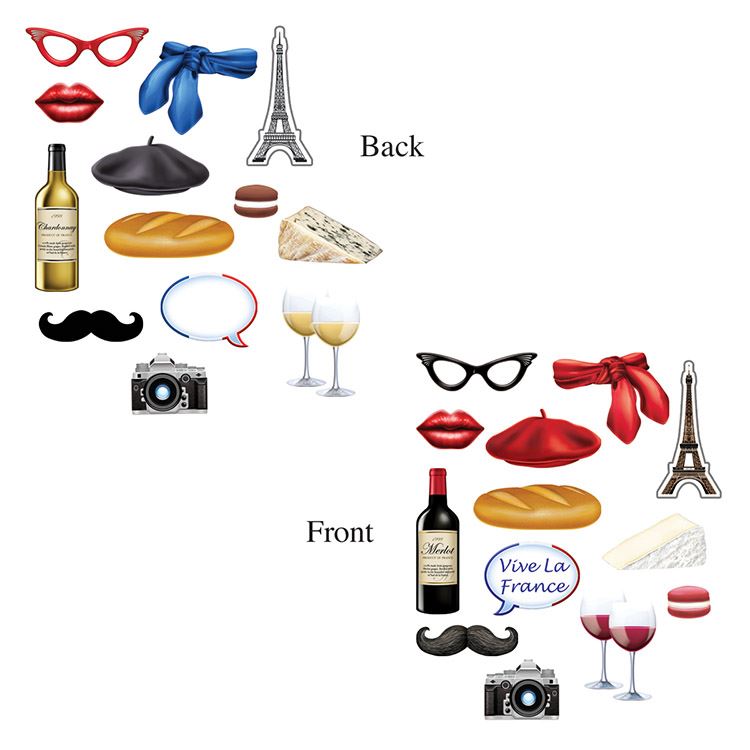 The French Photo Fun Signs are a great way to create unforgettable memories with your friends and family. They’ll set the mood for your international or France themed party and comes with all the things you love about France including wine, bread, cheese, the Eiffel Tower and more!Pick a few signs, hold them up to your face, and snap the photo. Your guests will have a picture to take home as a memento of all the fun they had.Made of cardstock and printed on two sides with different designs. Sizes range in measurement from 3 ½ inches to 12 inches. Contains fourteen (14) pieces per package.