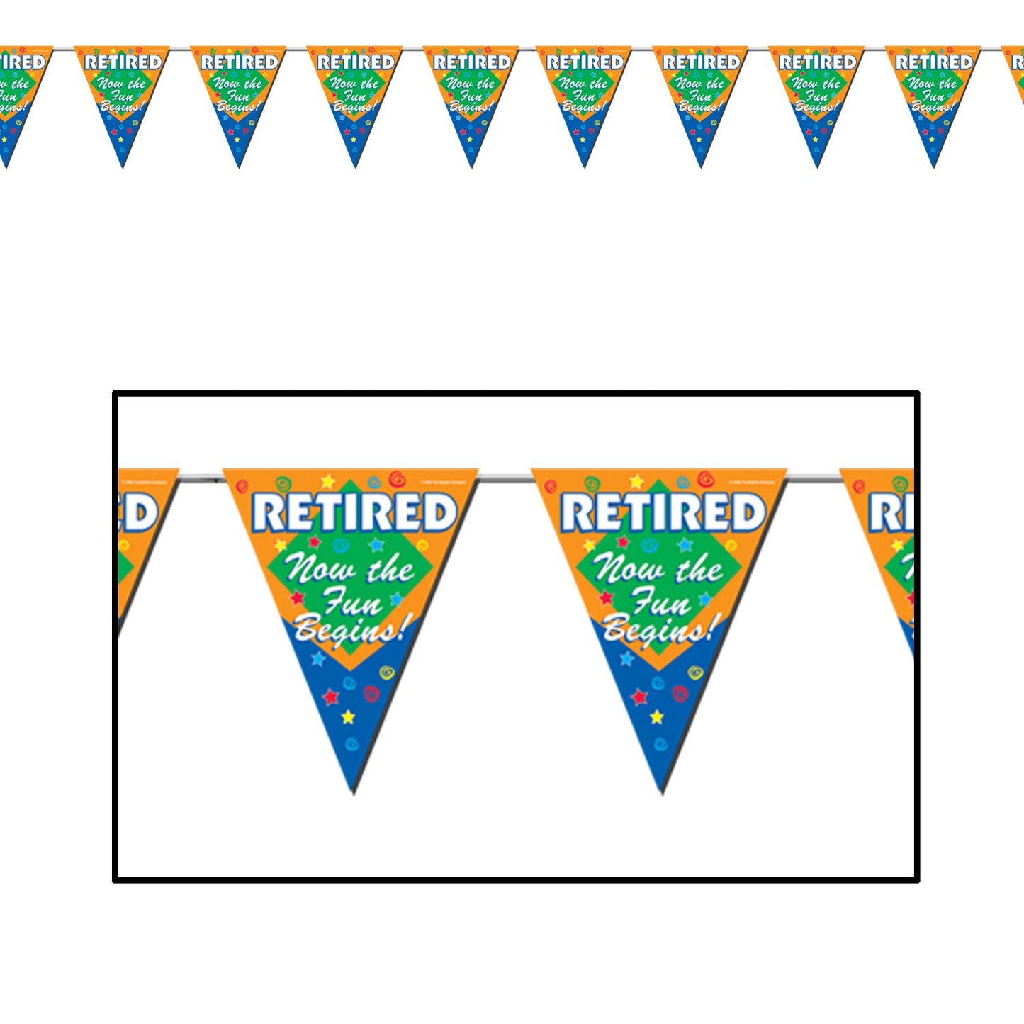 If you have a coworker or love one retiring display this Retired Pennant Banner loud and proudly for everything they have accomplished. With this inexpensive party supply decorate a coworker’s office or this Retired Pennant Banner will be a great decoration for a retirement party. This banner measures 12 feet long that can be used to decorate indoors or outdoors and comes with 12 pennants that are printed on one side. Checkout the retirement decorations that match this banner, such as the Retirement Whirls and Retired - Now The Fun Begins Centerpiece.