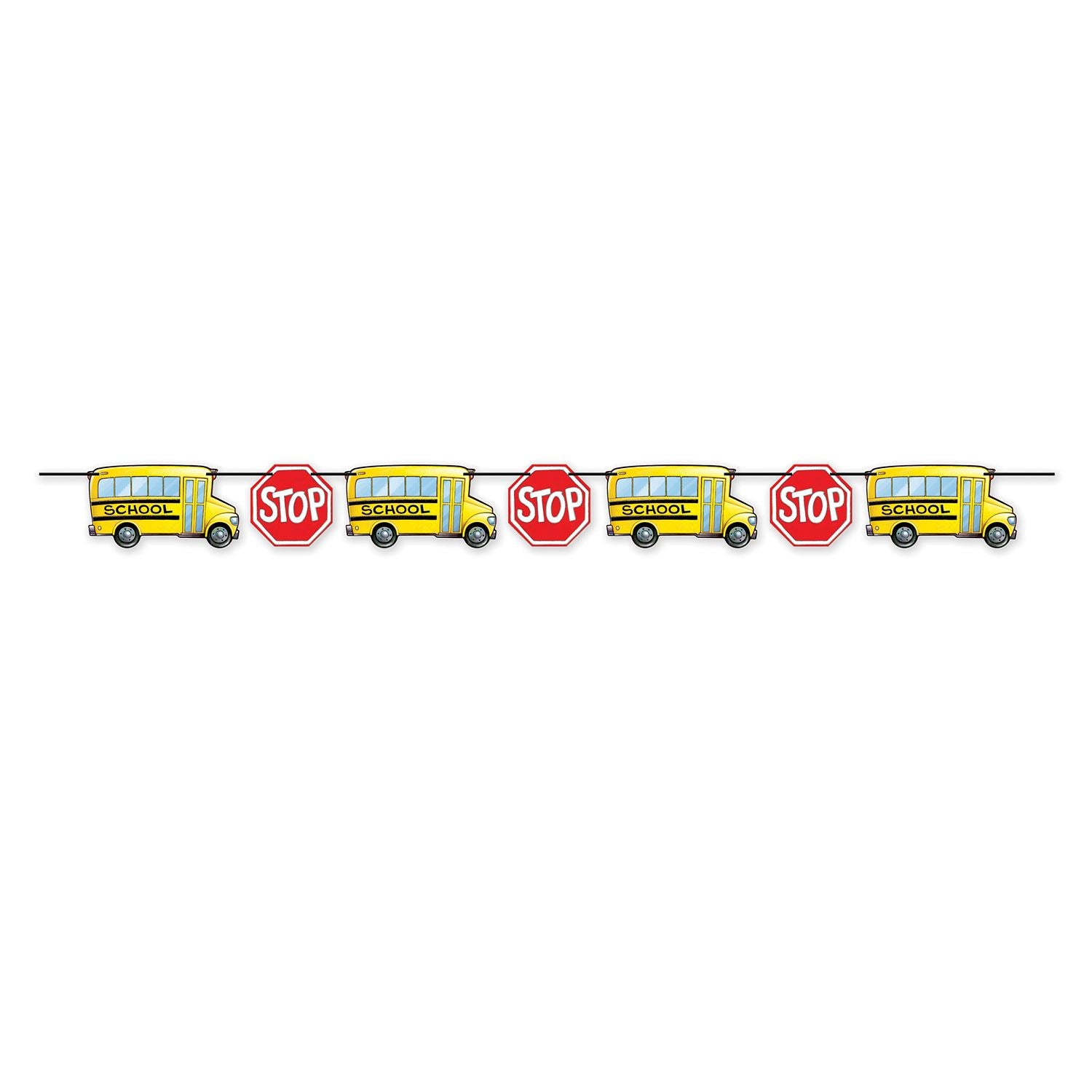 School Bus StreamerGet ready for back to school with the School Bus Streamer! Hang it on the wall or across the doorway to greet the students as you welcome them back their on first day.It features alternating school bus and stop sign cutouts and will add a colorful display to your classroom. t’ll give the room a fun and cheerful setting and add a great start to the new school year.Made of cardstock and printed on one side. Each streamer is 8 feet long and 6 inches tall. Contains one (1) per package. Simple assembly required.