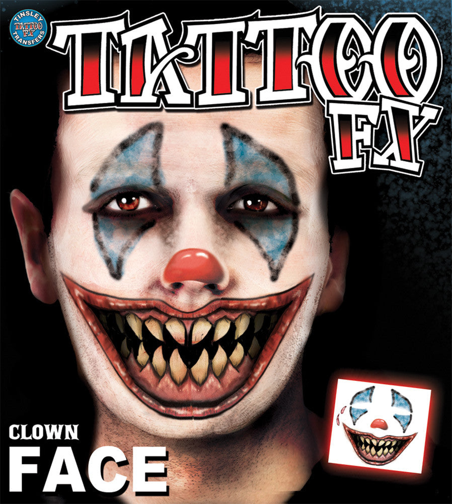 Everyone loves clown right? Not! Simple to apply, standardtattoo that instantly gives you the creepiest clown look youcan imagine. Supply your own white face makeup to completethe look. Instructions included!